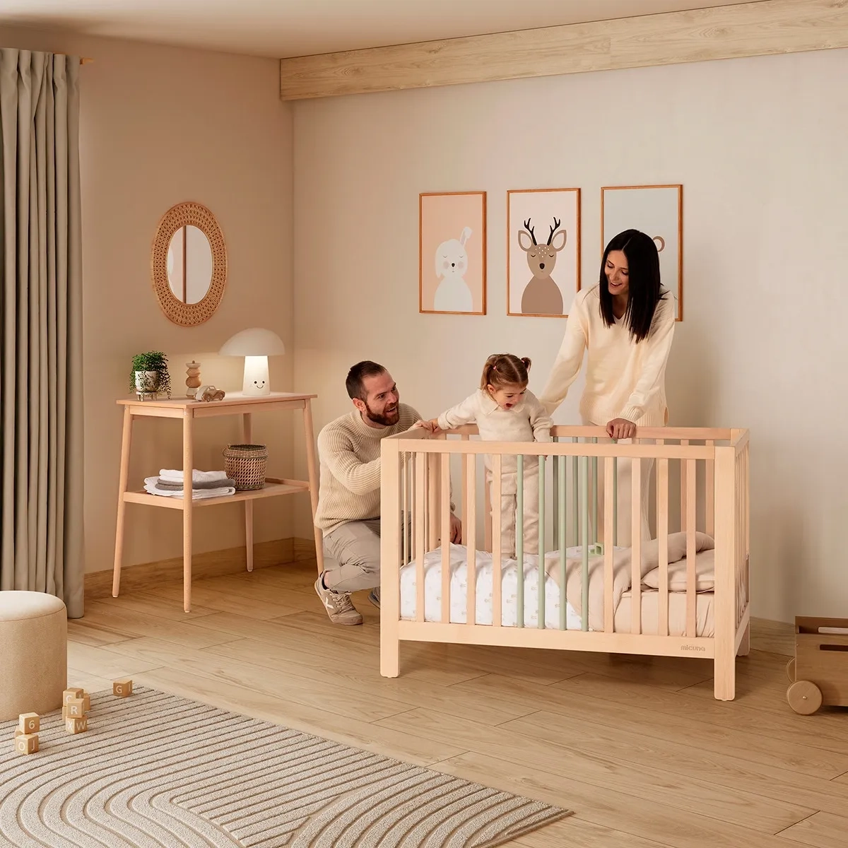 Кроватка Micuna Nayra оснащена поворотными колесиками, два из которых имеют стопор. Благодаря им вы сможете без труда поменять место кроватки в комнате, либо поместить ее в другую комнату при необходимости. Когда ребенок подрастет, колеса можно снять, оставив статичные ножки. Кроватка для новорожденных Micuna Nayra имеет безопасное расстояние между ламелями.