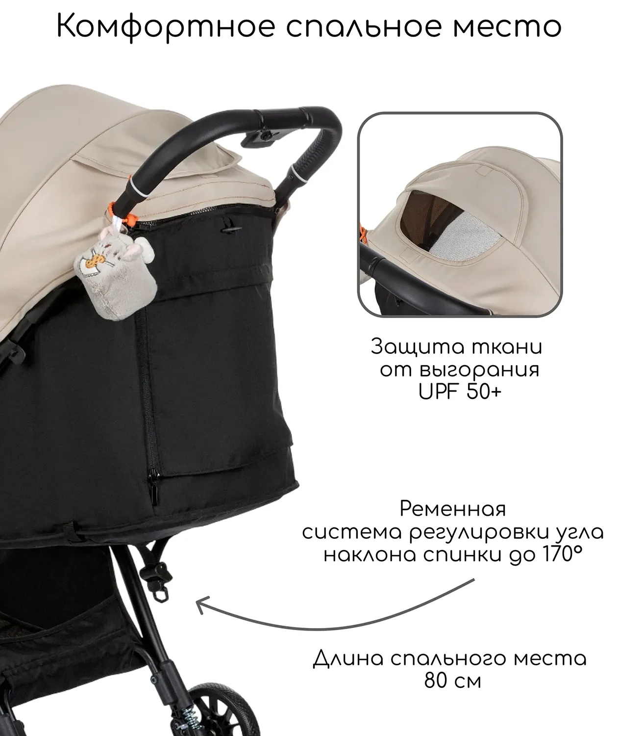- Большой капор и прочный козырёк с защитой от солнца UPF 30+